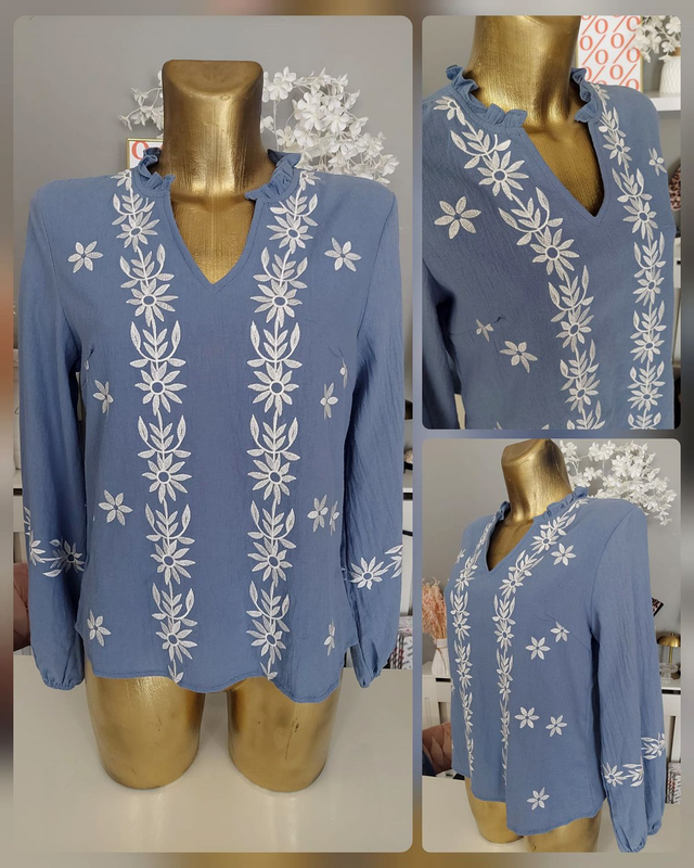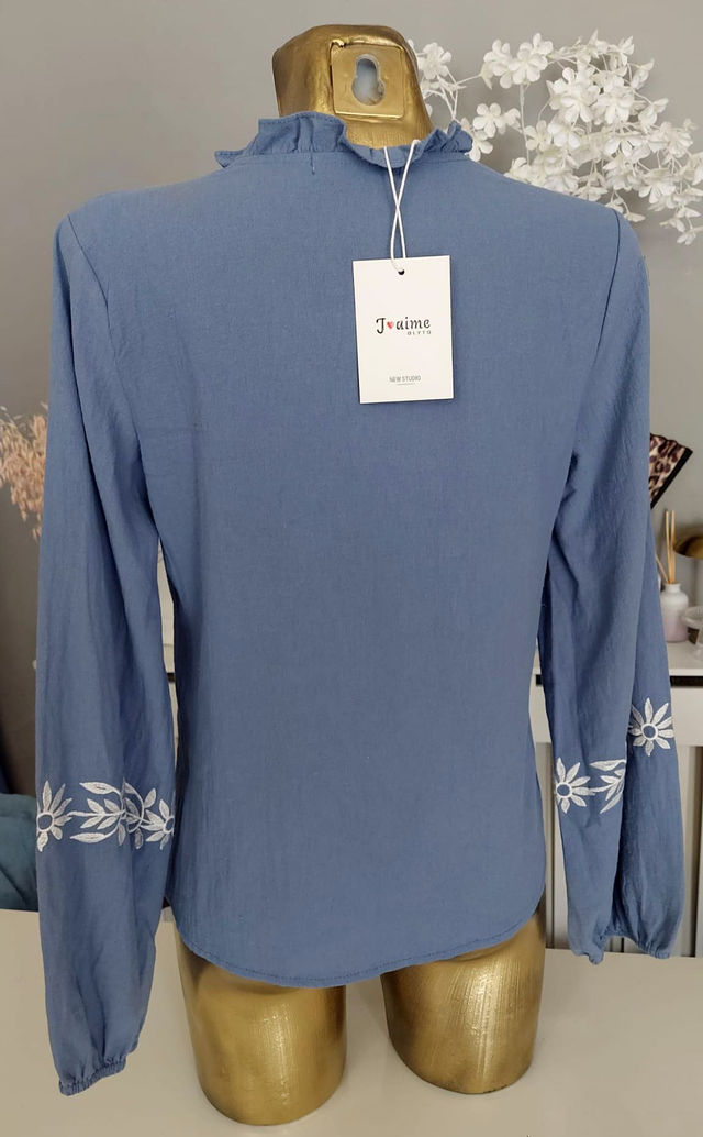 Hellblaue Bluse mit Blüten Stickerei in weiß Gr S M