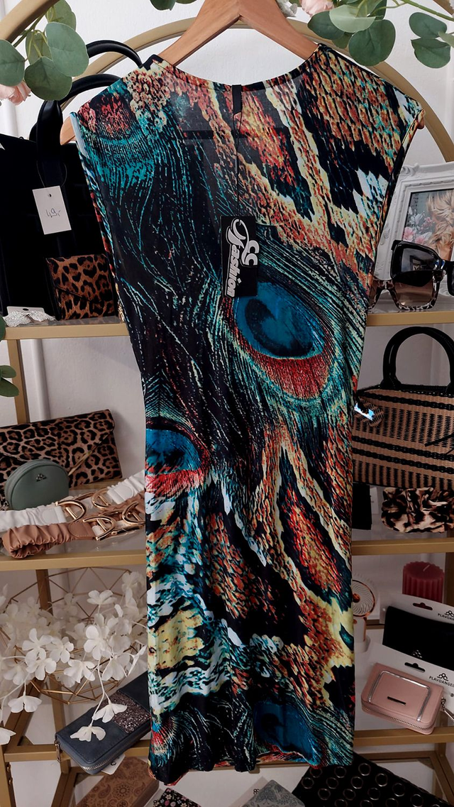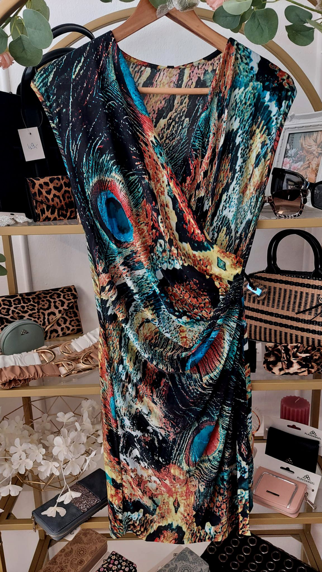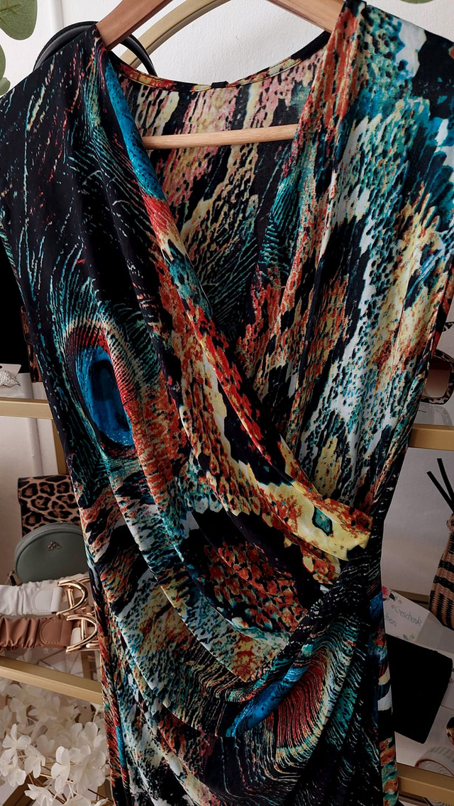 Wickel Look Kleid grün gelb schwarz Pfau Gr M 38